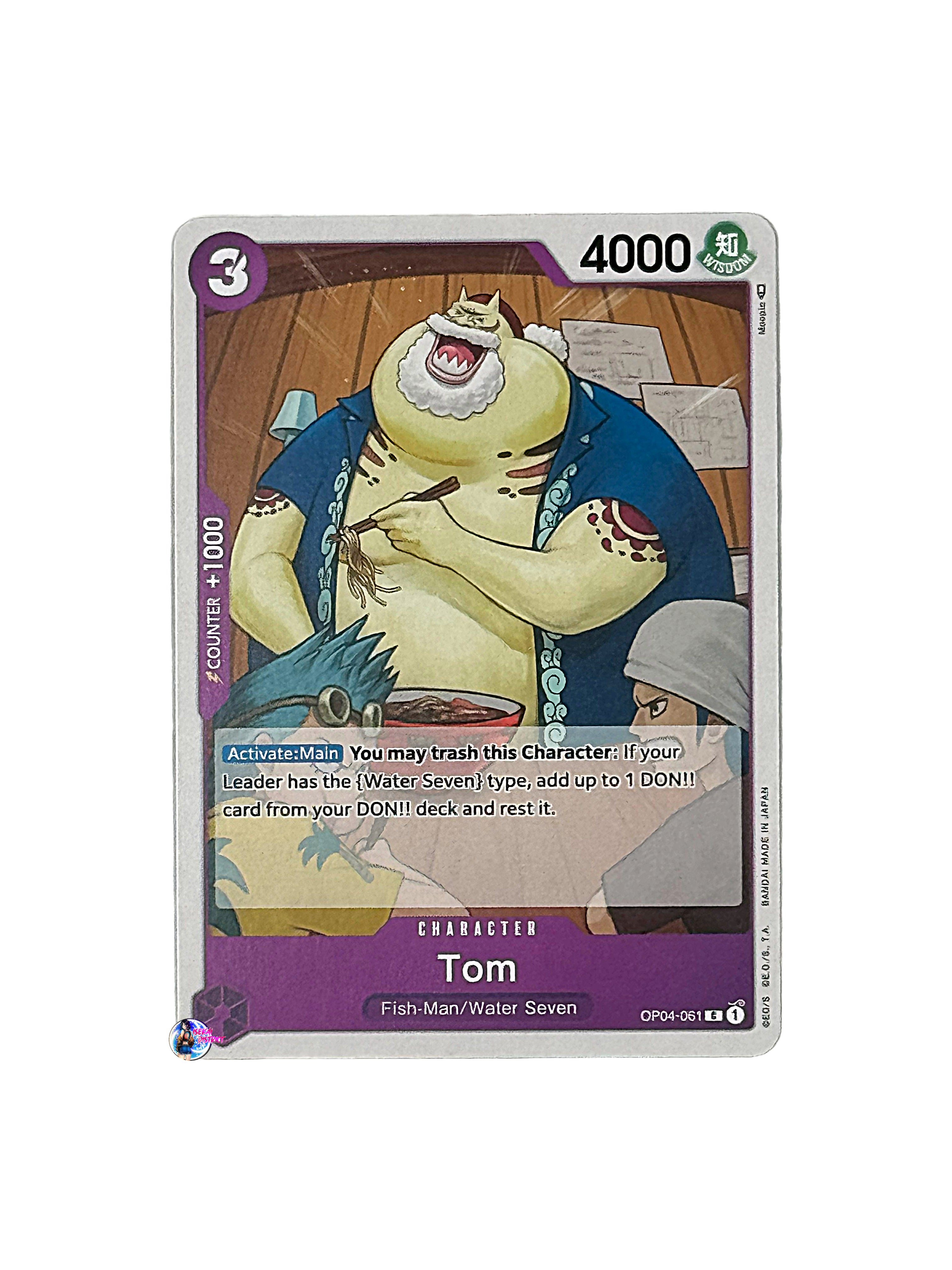 Card Type: CharacterColor: PurpleCost: 3Power: 4000Attribute: WisdomSubtype(s): Fish-Man, Water SevenRarity: Common Description: Tom from the Kingdoms of Intrigue (OP04-061) set...