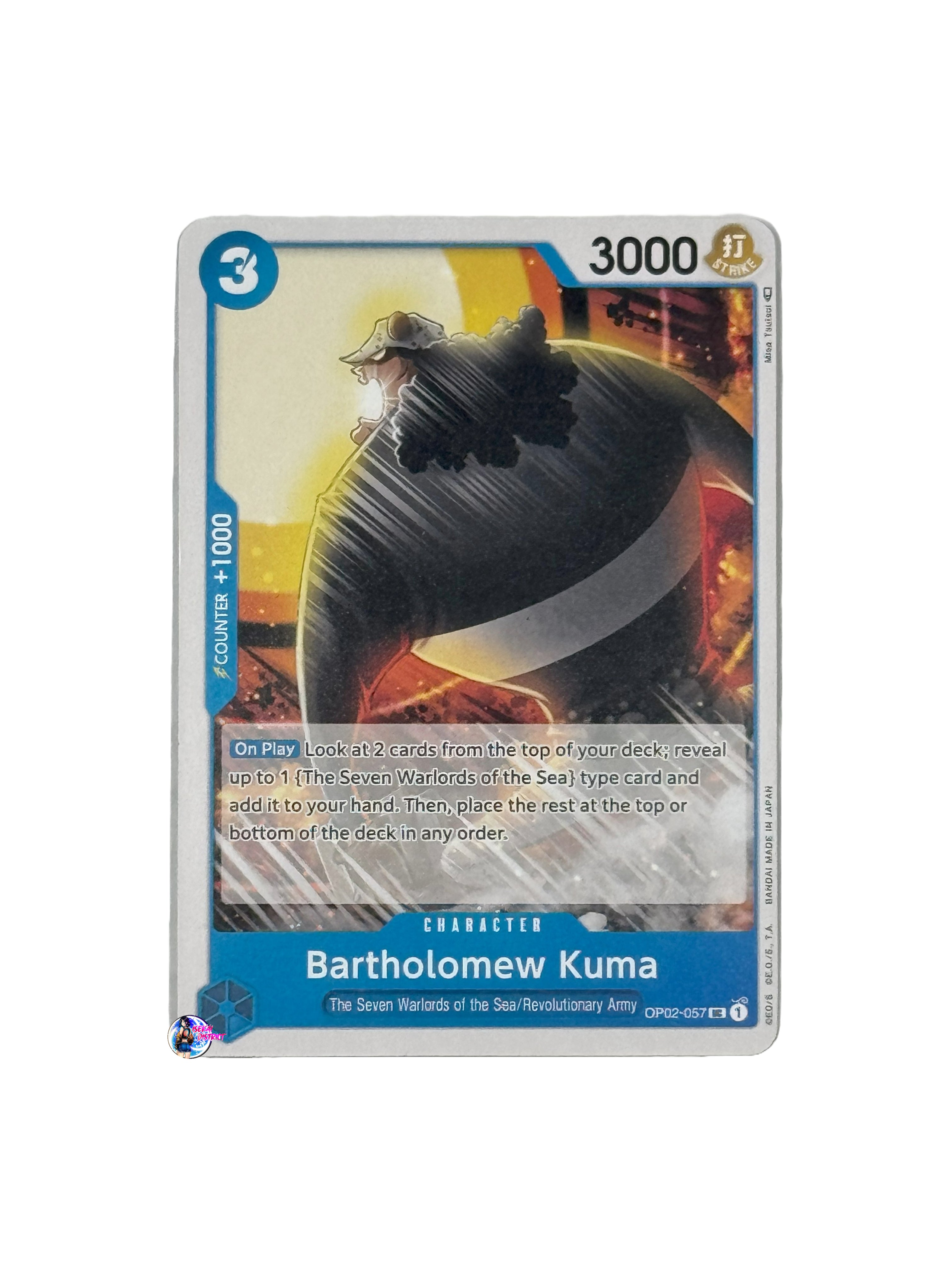 Card Type: CharacterColor: BlueCost: 3Power: 3000Attribute: StrikeSubtype(s): Revolutionary Army, The Seven Warlords of the SeaRarity: Uncommon Description: Introducing Bartholomew Kuma...