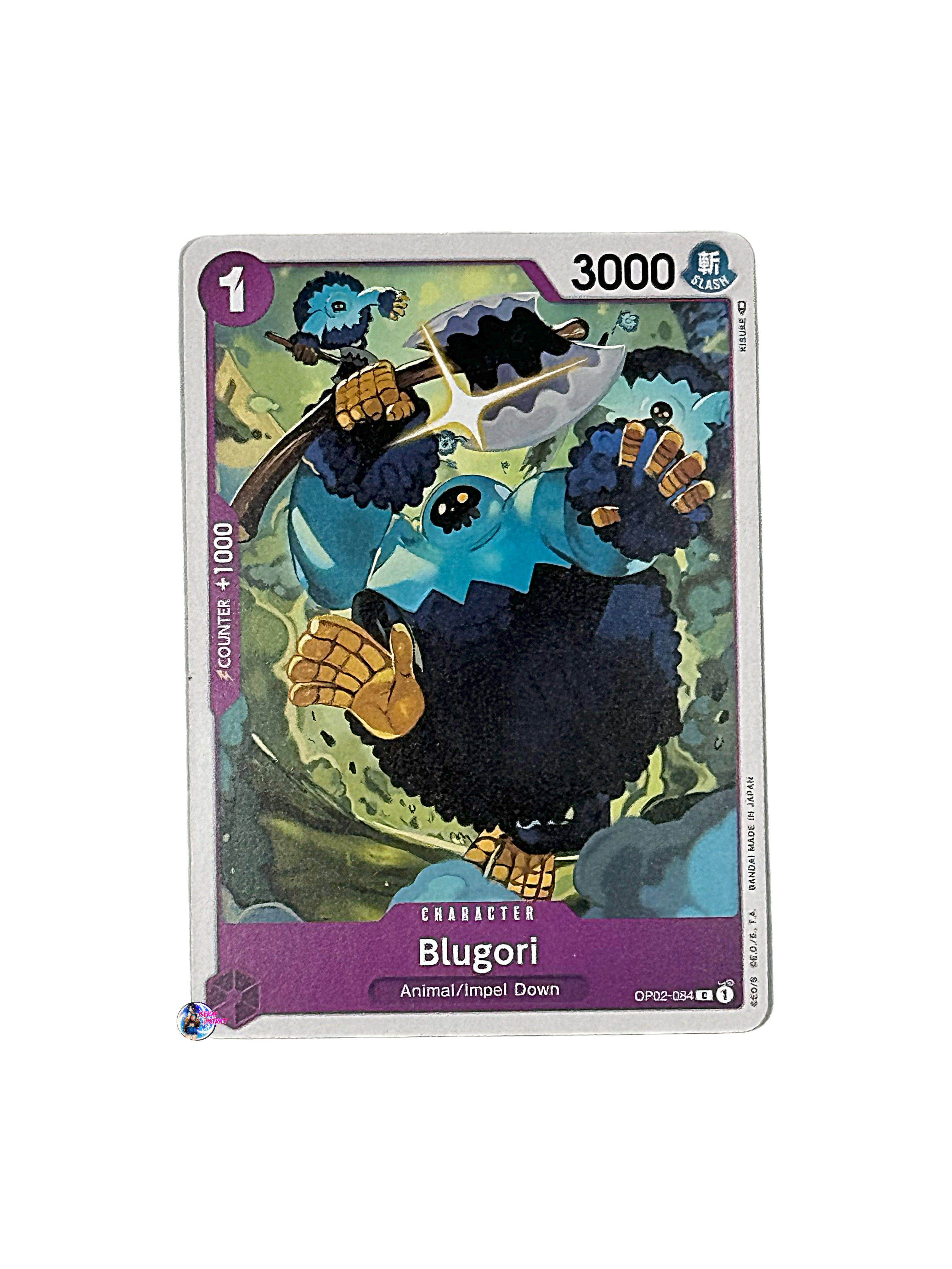 Card Type: CharacterColor: PurpleCost: 1Power: 3000Attribute: SlashSubtype(s): Animal, Impel DownRarity: Common Description: Blugori from the Paramount War (OP02-084) set is...