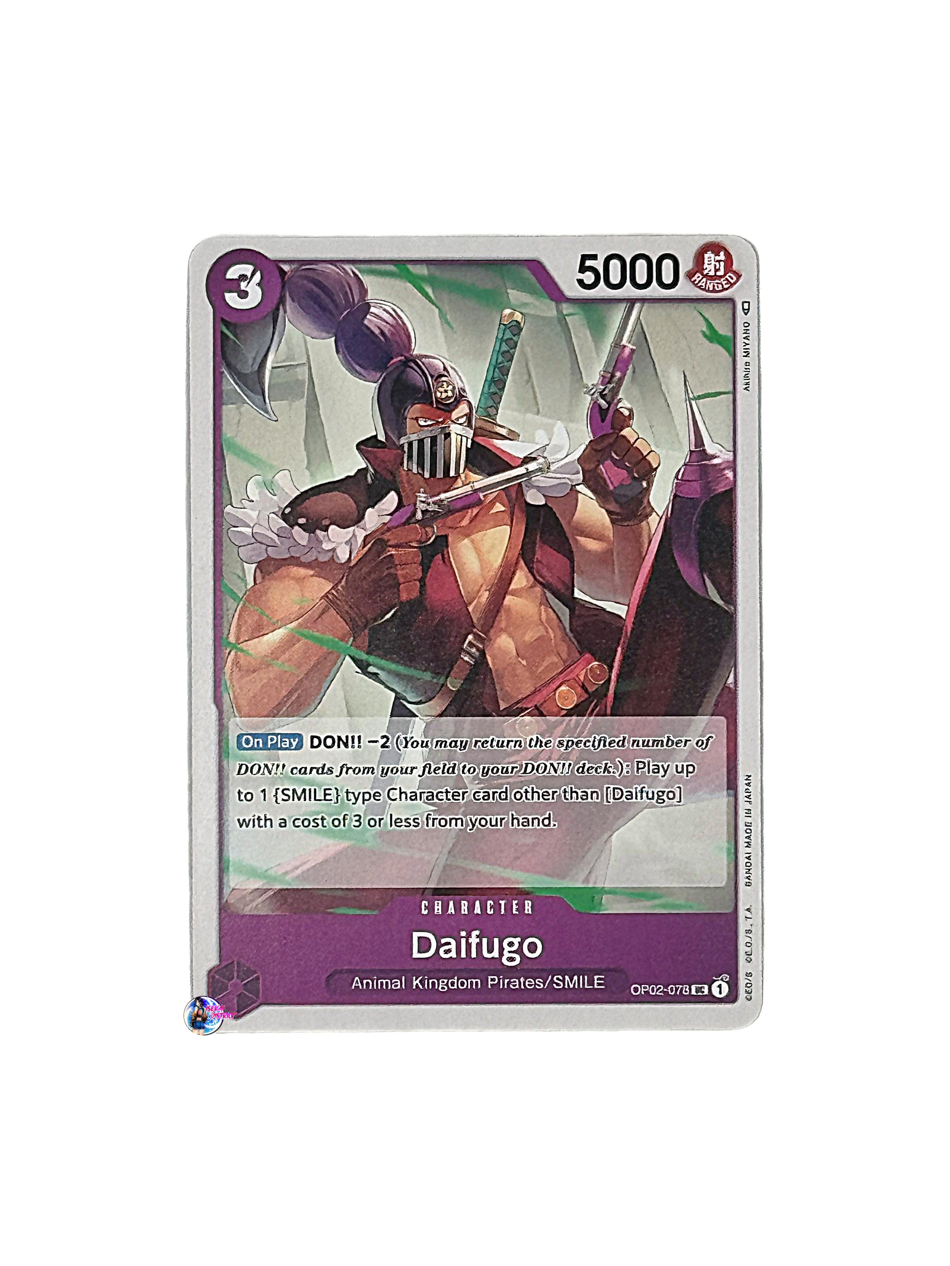 Card Type: CharacterColor: PurpleCost: 3Power: 5000Attribute: RangedSubtype(s): Animal Kingdom Pirates, SMILERarity: Uncommon Description: Daifugo from the Paramount War (OP02-078) set...