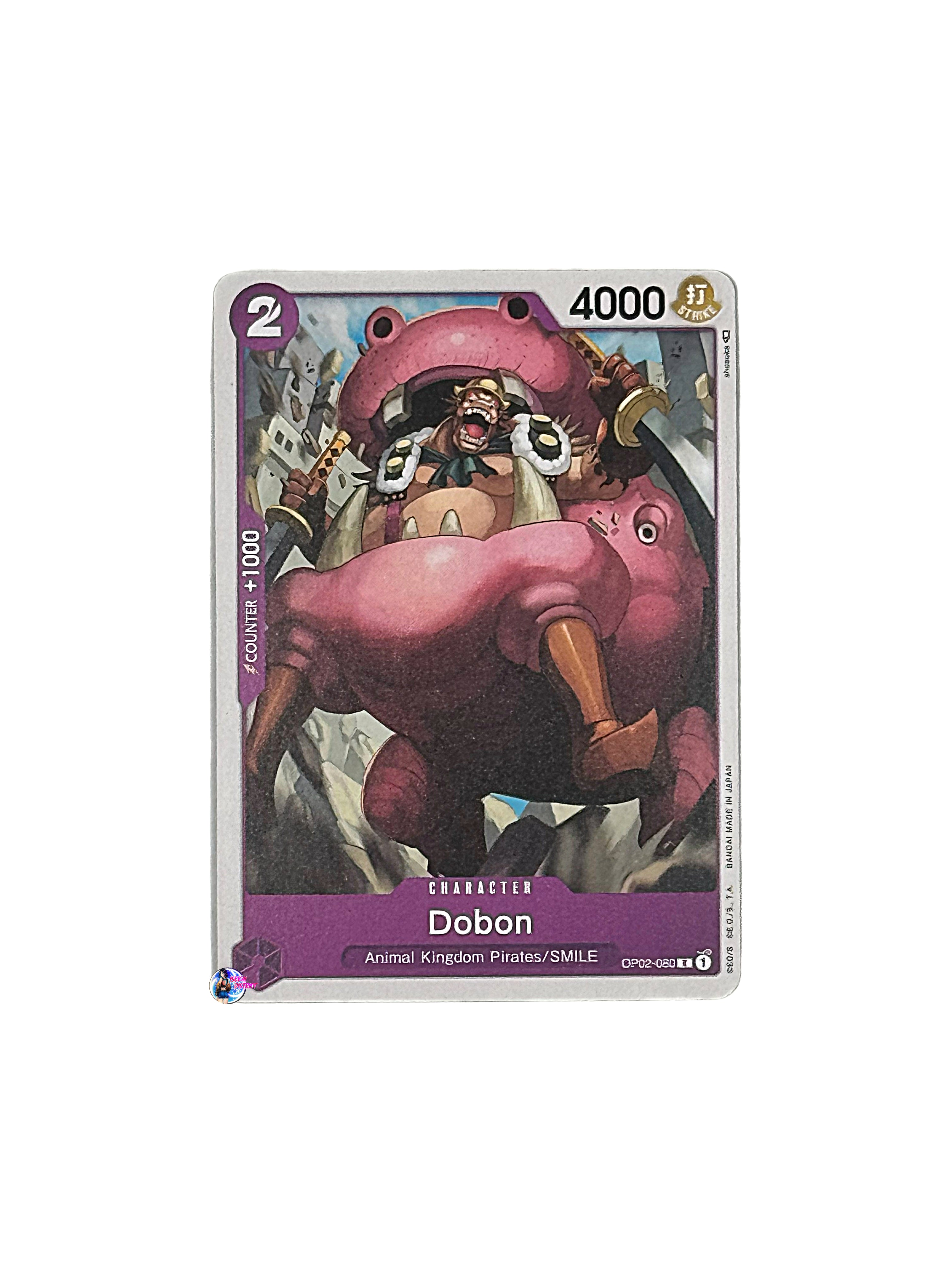 Card Type: CharacterColor: PurpleCost: 2Power: 4000Attribute: StrikeSubtype(s): Animal Kingdom Pirates, SMILERarity: Common Description: Dobon from the Paramount War (OP02-080) set...