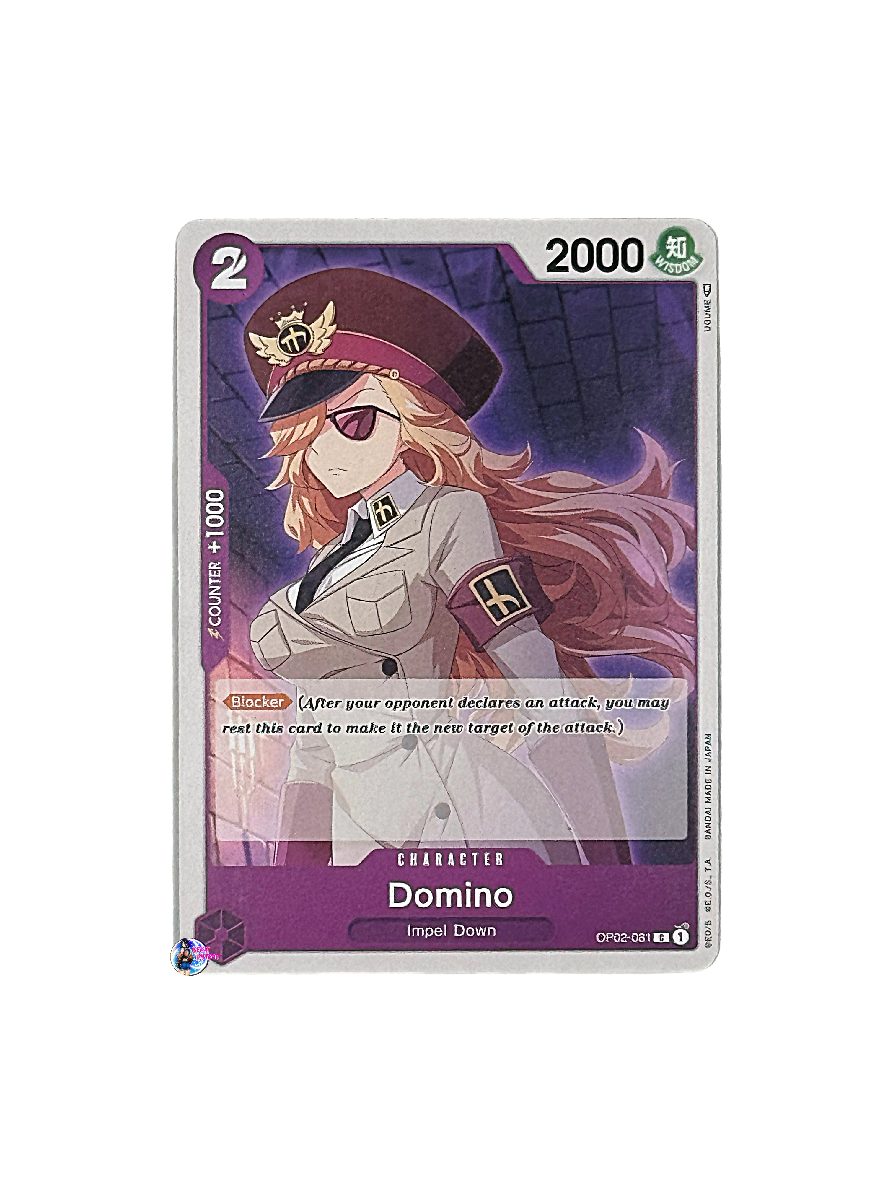 Card Type: CharacterColor: PurpleCost: 2Power: 2000Attribute: WisdomSubtype(s): Impel DownRarity: Common Description: Domino from the Paramount War (OP02-081) set is a...