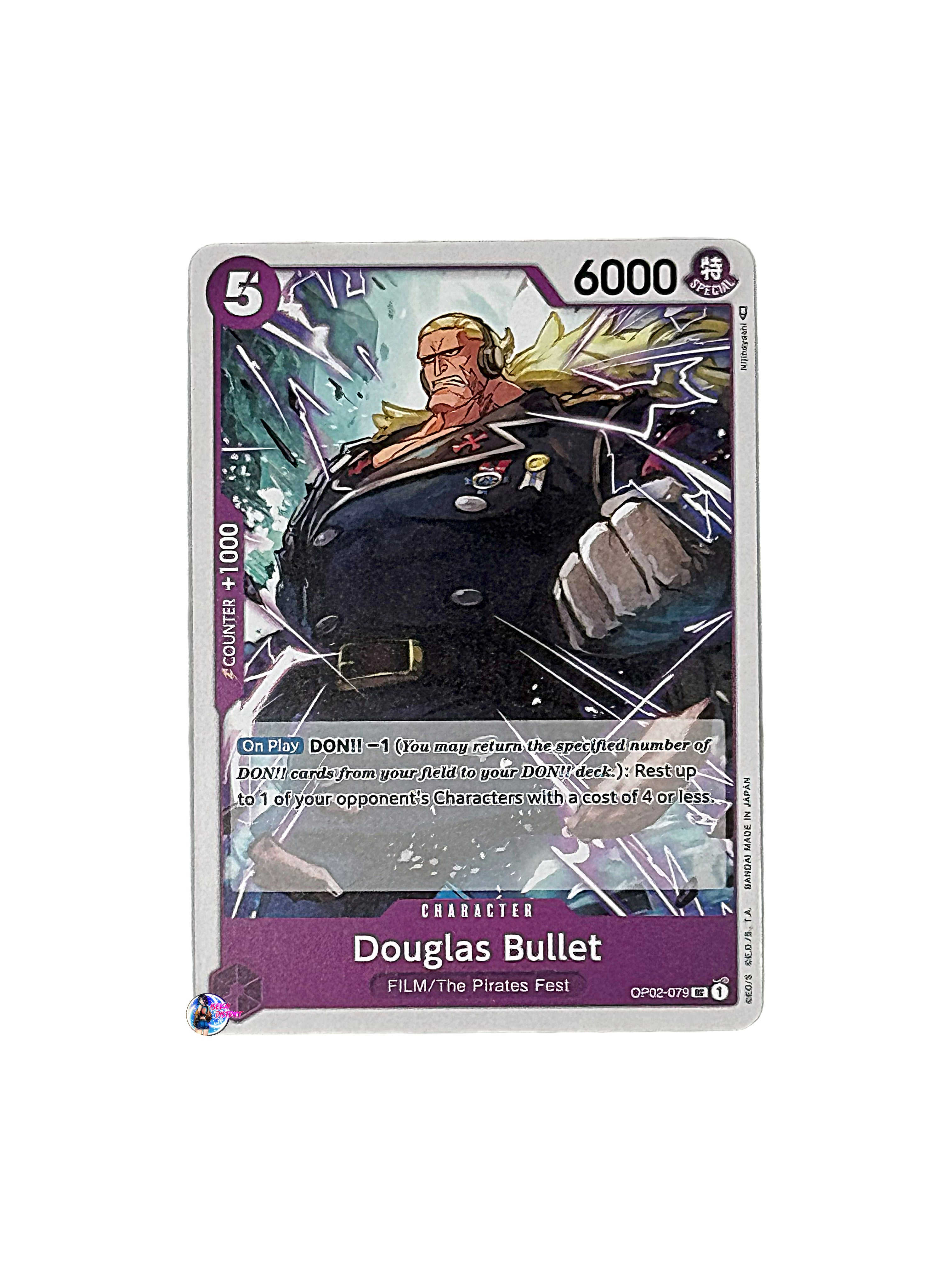 Card Type: CharacterColor: PurpleCost: 5Power: 6000Attribute: SpecialSubtype(s): FILM, The Pirates FestRarity: Uncommon Description: Douglas Bullet from the Paramount War (OP02-079)...