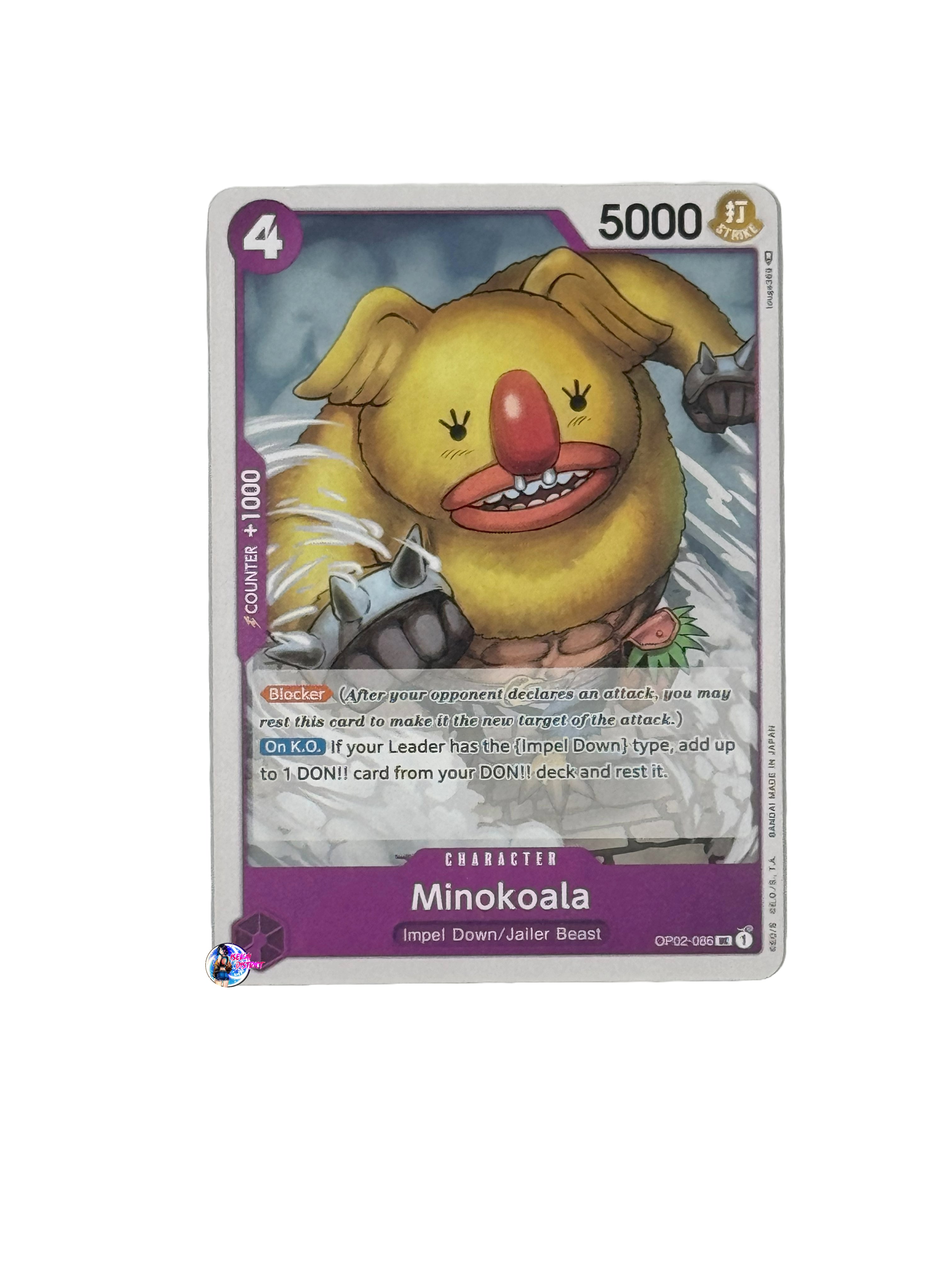 Card Type: CharacterColor: PurpleCost: 4Power: 5000Attribute: StrikeSubtype(s): Impel Down, Jailer BeastRarity: Uncommon Description: Introducing Minokoala from the Paramount War (OP02-086)...