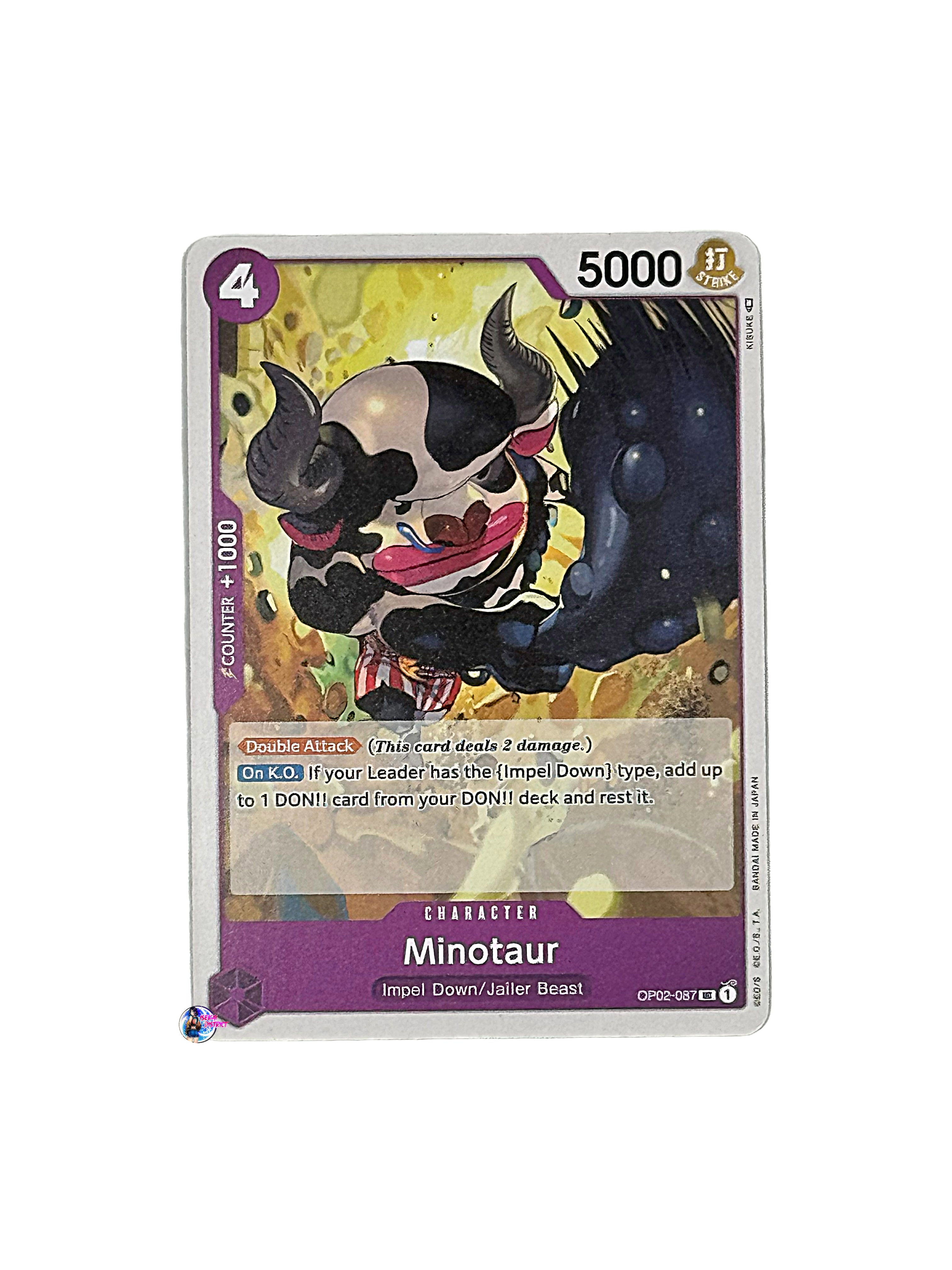 Card Type: CharacterColor: PurpleCost: 4Power: 5000Attribute: StrikeSubtype(s): Impel Down, Jailer BeastRarity: Uncommon Description: Minotaur from the Paramount War (OP02-087) set...