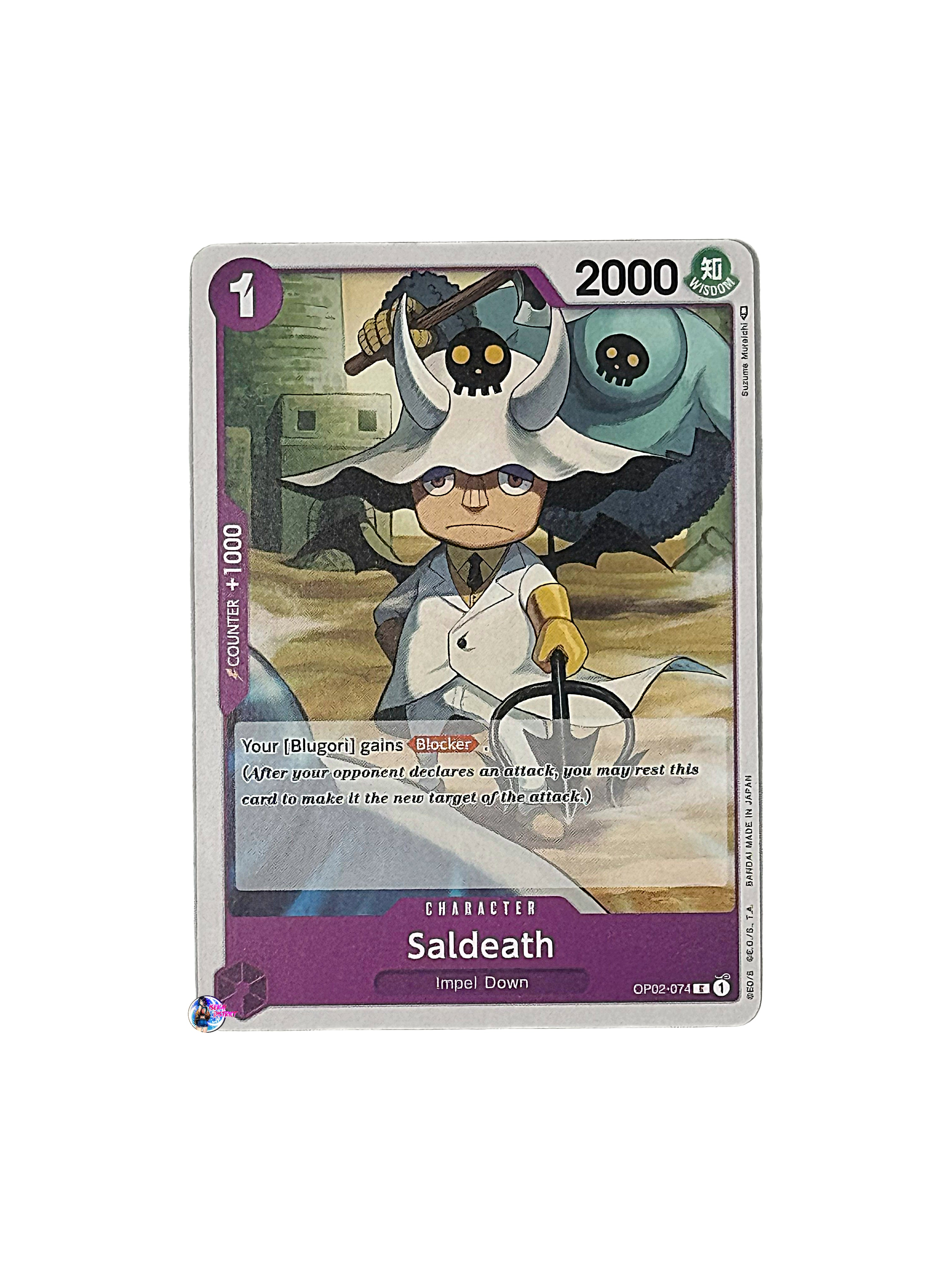 Card Type: CharacterColor: PurpleCost: 1Power: 2000Attribute: WisdomSubtype(s): Impel DownRarity: Common Description: Saldeath from the Paramount War (OP02-074) set is a...