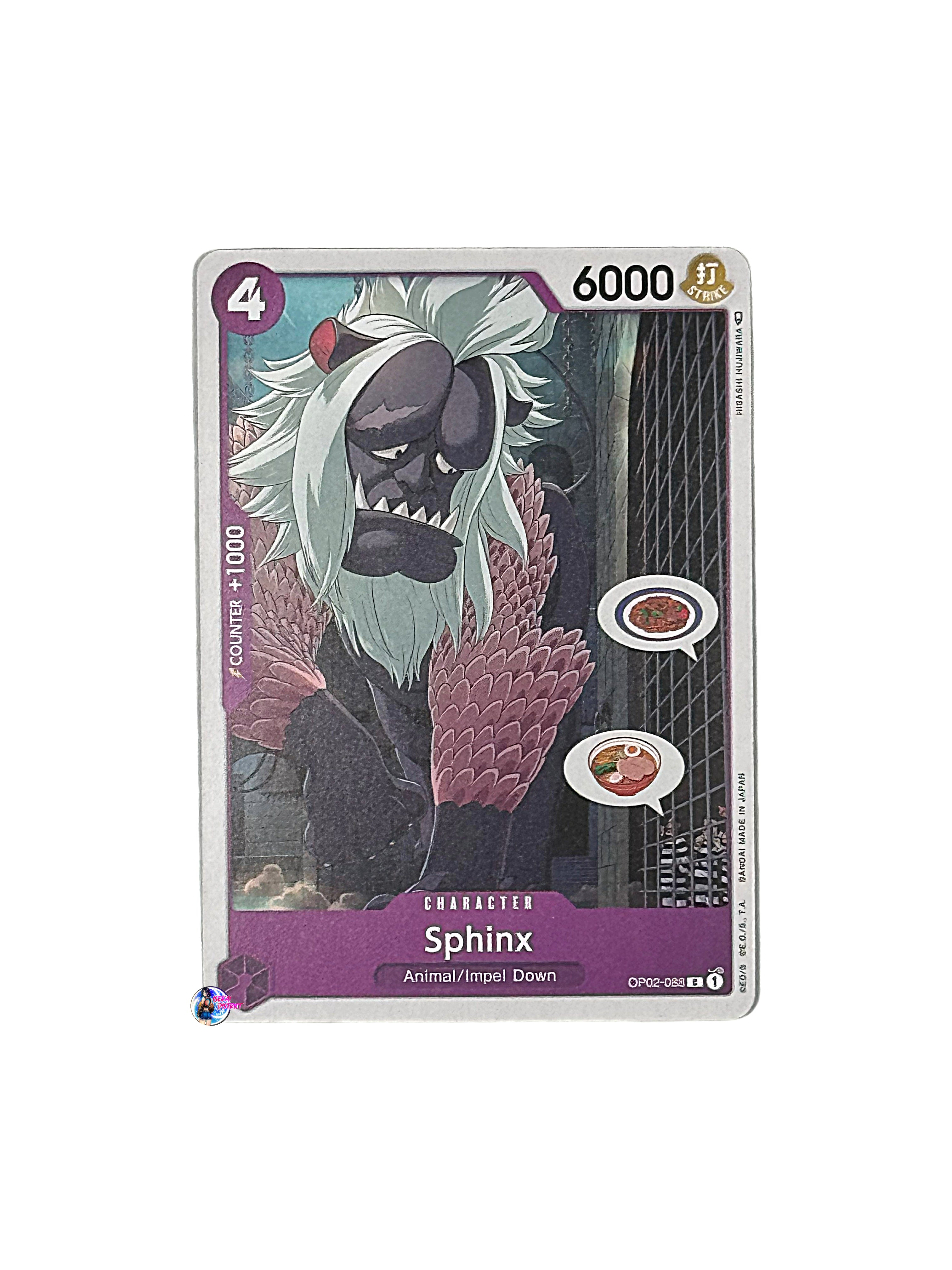 Card Type: CharacterColor: PurpleCost: 4Power: 6000Attribute: StrikeSubtype(s): Animal, Impel DownRarity: Common Description: Sphinx from the Paramount War (OP02-088) set is...